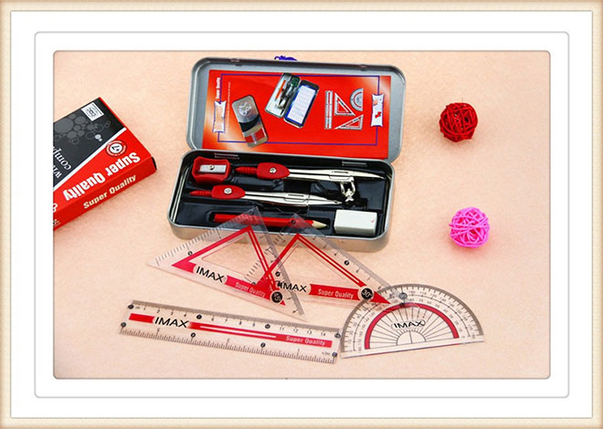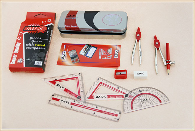 1 compass. 1 divider. 1 15cm ruler. 1 45-45-90 degree set square 1 30-60-90 degree set square 1 180degree protractor 1 3.5inch short pencil 1 eraser 1 sharpener 1 timetable