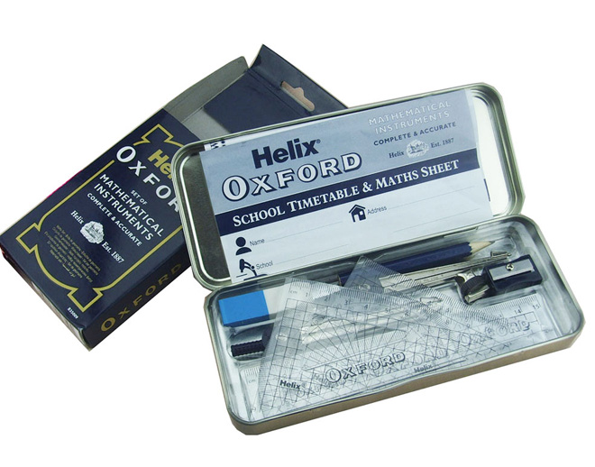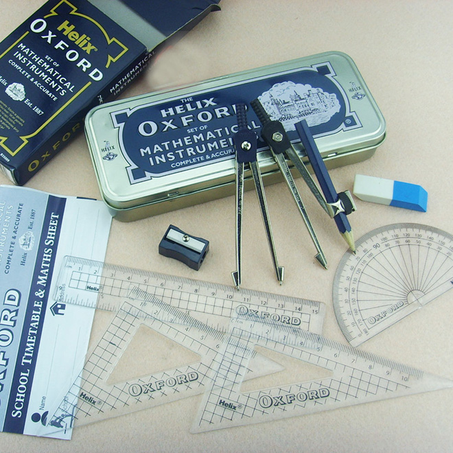 1 compass 1 divider. 1 15cm ruler. 1 45-45-90 degree set square 1 30-60-90 degree set square 1 180degree protractor 1 3.5inch short pencil 1 eraser 1 sharpener 1 timetable Packaging Details: 12sets/inner box,144sets/carton