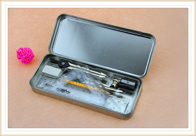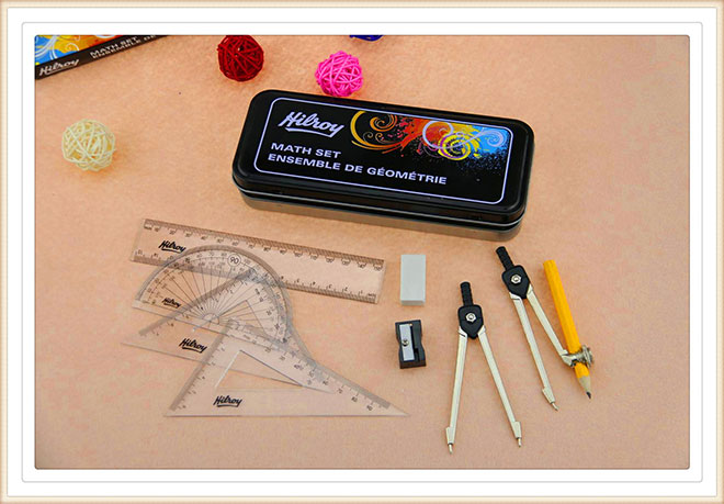 1 compass. 1 divider. 1 15cm ruler. 1 45-45-90 degree set square 1 30-60-90 degree set square 1 180degree protractor 1 3.5inch short pencil 1 eraser 1 sharpener