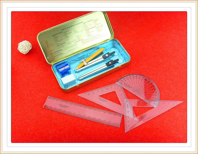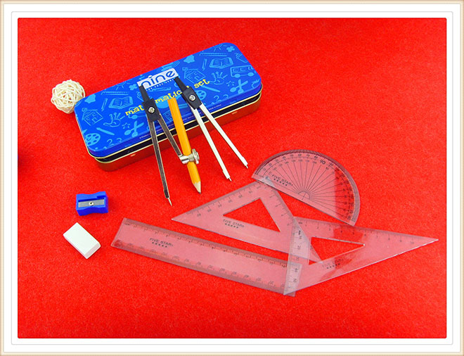 1 compass. 1 divider. 1 15cm ruler. 1 45-45-90 degree set square 1 30-60-90 degree set square 1 180degree protractor 1 3.5inch short pencil 1 eraser 1 sharpener