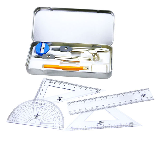 1 zinc alloy compass. 1 zince alloy divider. 1 scale in 15cm, 1 set square in 45-45-90 degree 1 degree set square in 30-60-90 degree 1 protractor in 180degree 1 3.5inch short pencil 1 eraser 1 sharpener Packaging Details: 12sets/inner box,144sets/carton