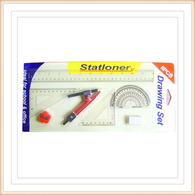 1 compass in plastic 1 15cm ruler. 1 45-45-90 degree set square 1 30-60-90 degree set square 1 180degree protractor 1 3.5inch short pencil 1 eraser 1 sharpener