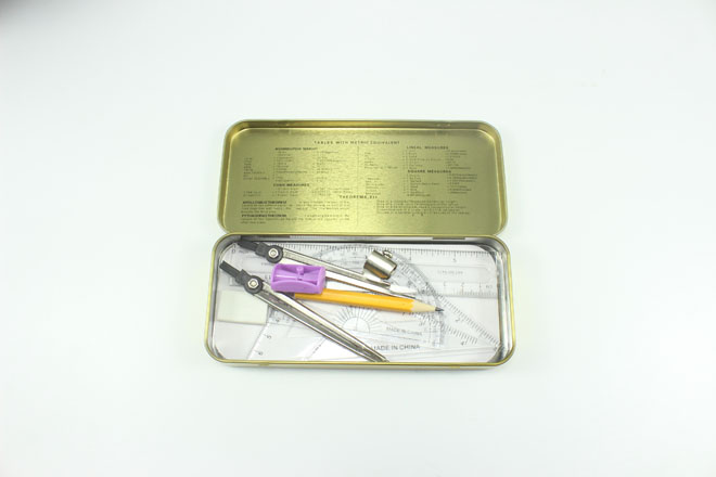 1 iron compass (with short safety needle)1 iron divider (with short safety needle)1 15cm straight ruler1 45-45-90 degree set square1 30-60-90 degree set square1 180degree protractor1 3.5inch short pencil1 eraser 1 sharpener