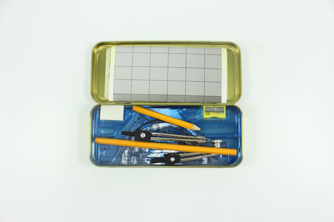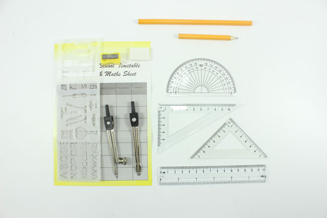 1 x compass ,1 x divider, 4 x plastic rulers (1 x straight ruler, 1 x 45/ 90 triangle ruler, 1 x 30/ 60/ 90 triangle ruler,1 protractor), 2 x HB pencils (3.5 inches and 6.5 inches), 1 x eraser, 1 x sharpener, 1 x alphabet stencil, 1 x chemical stencil, 1 x timetable (with math sheet)