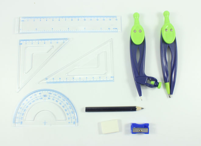 Geometry rulers includes 15 cm/ 6 inches straight ruler (inches and metric scale), 2 x triangle rulers,1 x protractor, transparent and through it you can read conveniently.