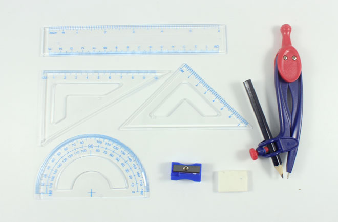 Geometry rulers includes 15 cm/ 6 inches straight ruler (inches and metric scale), 2 x triangle rulers,1 x protractor, transparent and through it you can read conveniently.
