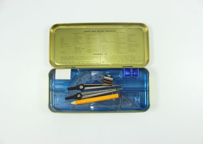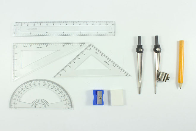 1 x compass ,1 x divider, 4 x plastic rulers (1 x straight ruler, 1 x 45/ 90 triangle ruler, 1 x 30/ 60/ 90 triangle ruler,1 protractor), 1x HB pencils (3.5 inches), 1 x eraser, 1 x sharpener.