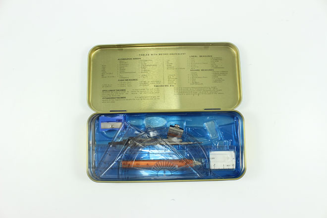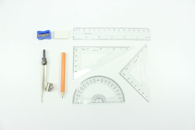 1 x compass , 4 x plastic rulers (1 x straight ruler, 1 x 45/ 90 triangle ruler, 1 x 30/ 60/ 90 triangle ruler,1 protractor),1 x HB pencils (3.5 inches),1 x eraser,1 x sharpener.