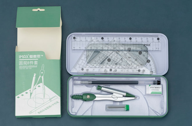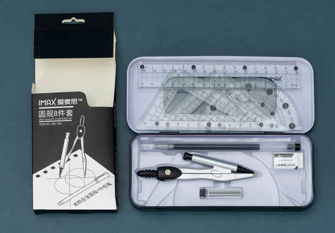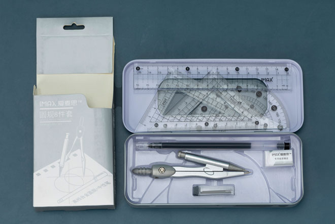 1 x compass , 4 x plastic rulers, 1 x HB pencils, 1 x eraser, 1 x sharpener.